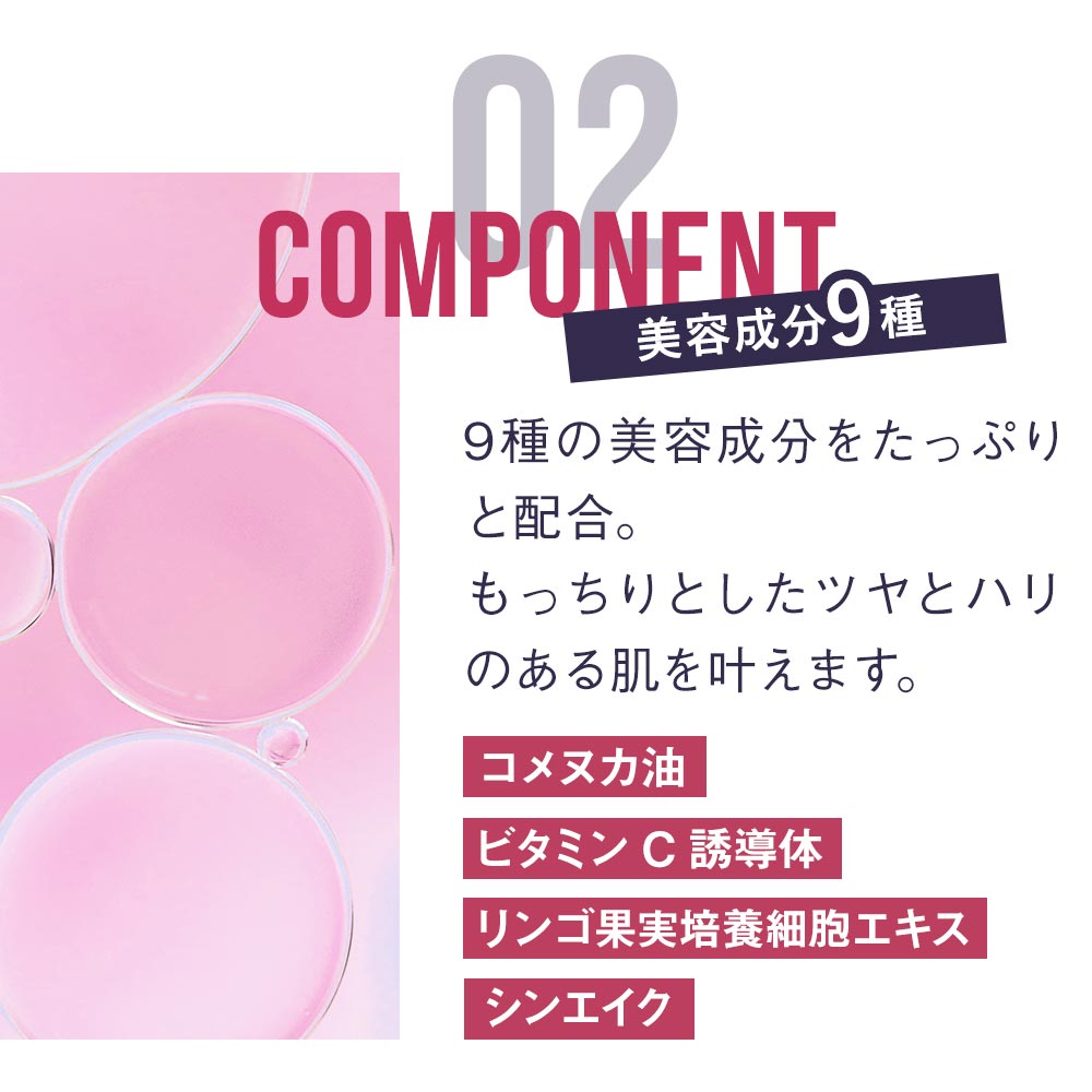 【全成分】水、グリセリン、DPG、BG、ペタイン、アラントイン、ヒアルロン酸N、リンゴ果実培観細胞エキス、ジ許酸ジペプチドジアミノブチロイルベンジルアミド、ボタンエキス、アルテア根エキス、カミツレ花エキス、セイヨウオトギリソウ花/葉/基エキス、フユボダイジュ花エキス、トウキンセンカ花エキス、ヤグルマギク花エキス、ローマカミツレ花エキス、アルニカ花エキス、ローズマリー葉エキス、オリーブ果実油、ホホバ種子油、コメヌカ油、オレイン酸ポリグリセリルー10、レシチン、アスコルビルグ」ルコシド、グリチルリチン酸2K、オウゴン根エキス、カンソウ根エキス、エチルヘキサン駿セチル、ステアリン酸グリセリル、オレイン酸ソルピタン、キリンタンガム、PEG-60水添ヒマシ油、PEG-50水添ヒマシ油、クエン酸、クエン酸N、メチルパラペン、フェノキシエタノール、EDTA-2Na、エタノール |