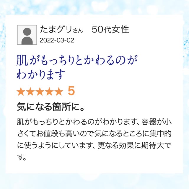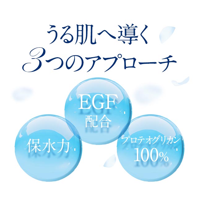 ヒアルロン酸の130%の保水力を誇り、潤いを与えてくれます。EGF作用も有り、肌の調子を整えます。