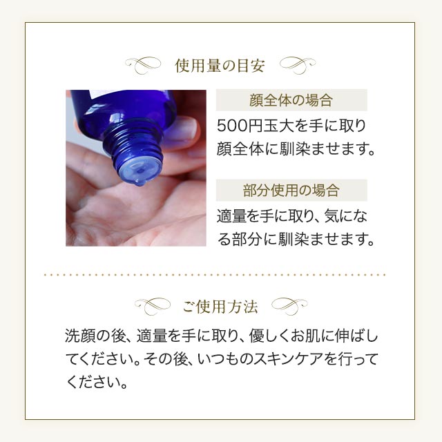 スポイトで適量を取り、お肌に優しく伸ばしてください。