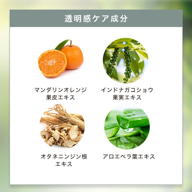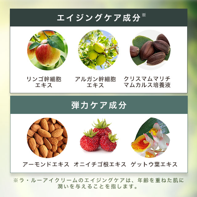 水、グリセリン、プロパンジオール、トリ(カプリル酸/カプリン酸/ミリスチン酸/ステアリン酸)グリセリル、トリエチルヘキサノイン、ベヘニルアルコール、テトラエチルヘキサン酸ペンタエリスリチル、ステアリン酸ソルビタン、ポリソルベート60、メドウフォーム油、レチノール、リンゴ果実培養細胞エキス、アルガニアスピノサ芽細胞エキス、アーモンドエキス、マタタビ果実エキス、クリスマムマリチマムカルス培養液、マンダリンオレンジ果皮エキス、オタネニンジン根エキス、インドナガコショウ果実エキス、レモングラス葉/茎エキス、カンゾウ根エキス、アロエベラ葉エキス、ユズ果実エキス、ゲットウ葉エキス、オニイチゴ根エキス、ムラサキバレンギクエキス、ジメチコン、グリセリルグルコシド、加水分解水添デンプン、ラウロイルグルタミン酸ジ(オクチルドデシル/フィトステリル/ベヘニル)、グリコシルトレハロース、グリチルリチン酸2K、ヒアルロン酸Na、イソマルト、トリ(カプリル酸/カプリン酸)グリセリル、アスコルビン酸Na、キサンタンガム、レシチン、PEG-40水添ヒマシ油、EDTA-2Na、カルボマー、ヒドロキシエチルセルロース、水酸化Na、トコフェロール、BG、エタノール、安息香酸Na、フェノキシエタノール |
