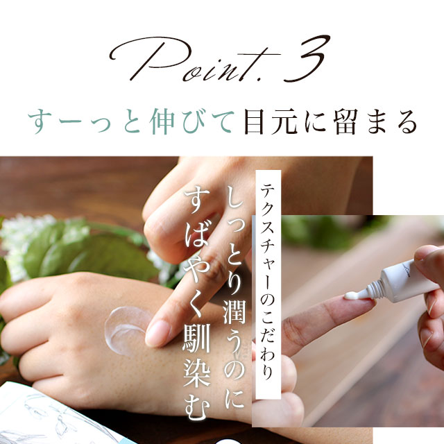 | あずき大の大きさにクリームを薬指へととります。 目の下、目尻、まぶたにかけてクリームを置き、後は優しく叩き込む様にクリームをなじませます。\ |