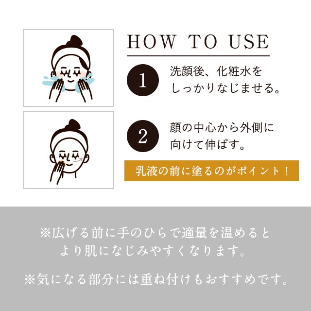 適量の美容液を手に取り、顔全体に広げる。 |
