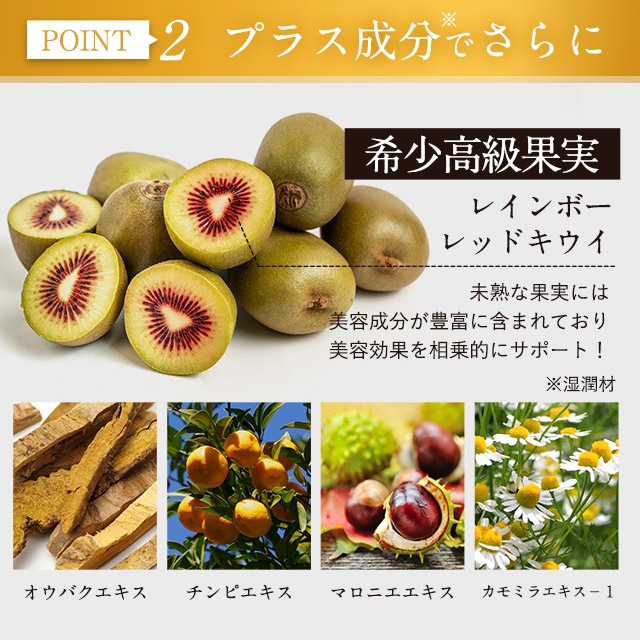 グリコシルトレハロース・水添デンプン分解物混合溶液、ヒドロキシエチルセルロース、濃グリセリン、 無水クエン酸、クエン酸Na、ピロ亜硫酸Na、BG、1,2-ペンタンジオール、キサンタンガム、ヒアルロン酸Na-2、フェノキシエタノール、オウバクエキス、タイムエキス-1、プルーン酵素分解物、サクシニルアテロコラーゲン液、 加水分解コラーゲン末、チンピエキス、マロニエエキス、カモミラエキス-1、キウイエキス、POE(60)硬化ヒマシ油、 ジイソステアリン酸グリセリル、スクワラン、水酸化K、ジエチレントリアミン5 酢酸5Na液、ヒドロキシエタンジホスホン酸液、カルボキシビニルポリマー