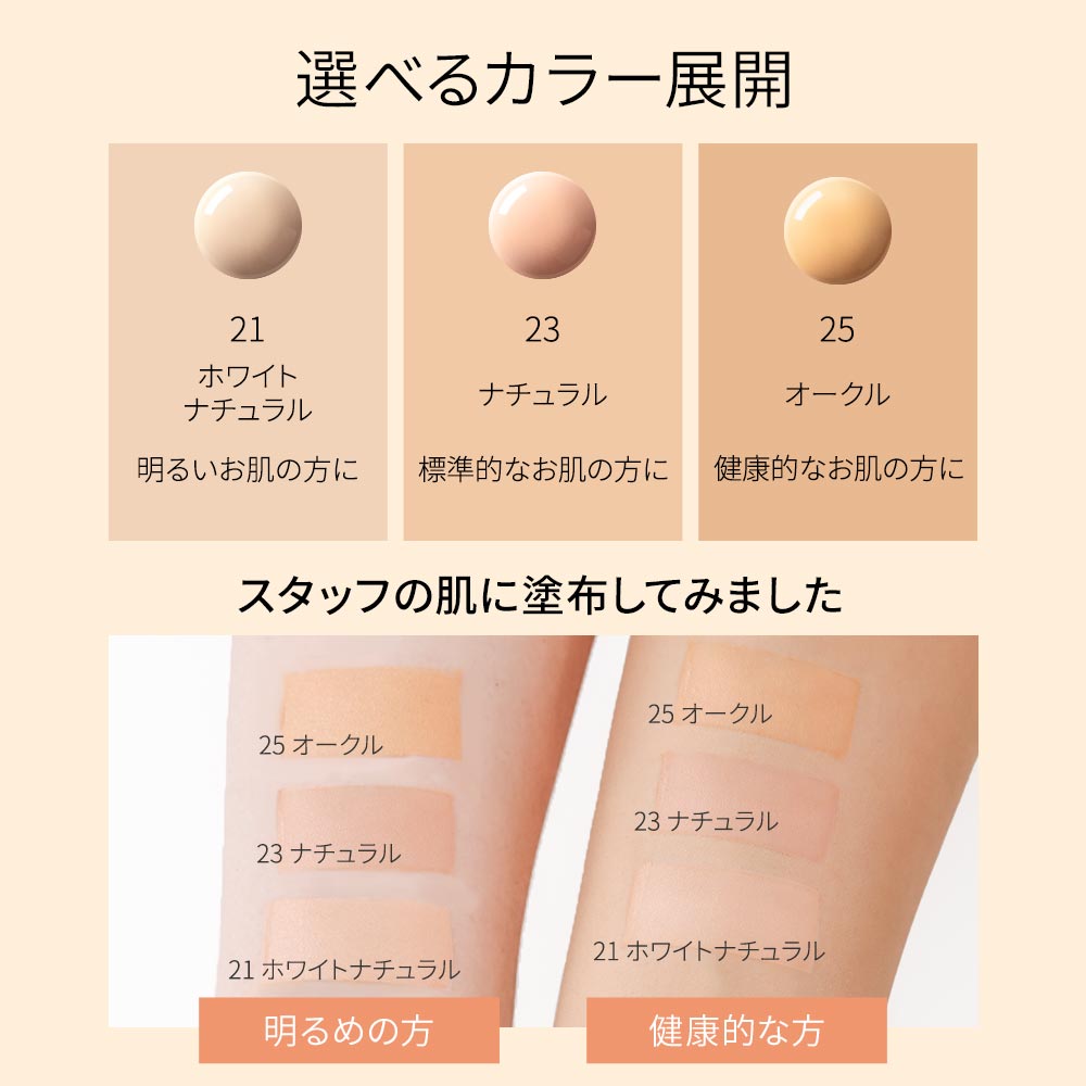 水,シクロペンタシロキサン,酸化チタン,酸化亜鉛,メトキシケイヒ酸エチルヘキシル,DPG,BG,セチルPEG/PPG-10/1ジメチコン,1,2-ヘキサンジオール,ナイアシンアミド,エチルヘキサン酸セチル,ビスエチルヘキシルオキシフェノールメトキシフェニルトリアジン,セスキオレイン酸ソルビタン,メタクリル酸メチルクロスポリマー,イソステアリン酸ソルビタン,水酸化Al,硫酸Mg,ラウロイルリシン,トリエトキシカプリリルシラン,ジステアルジモニウムヘクトライト,ステアリン酸,カプリル酸グリセリル,クエン酸トリエチル,シリカ,(ジメチコン/ビニルジメチコン)クロスポリマー,アデノシン,シクロテトラシロキサン,ジフェニルシロキシフェニルトリメチコン,アロエベラ葉エキス,ティーツリーエキス,チャ葉エキス,ツボクサエキス,香料,酸化鉄