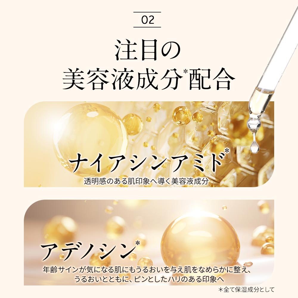 水,酸化チタン,シクロペンタシロキサン,酸化亜鉛,メトキシケイヒ酸エチルヘキシル,DPG,BG,セチルPEG/PPG-10/1ジメチコン,エチルヘキサン酸セチル,1,2-ヘキサンジオール,ナイアシンアミド,ビスエチルヘキシルオキシフェノールメトキシフェニルトリアジン,セスキオレイン酸ソルビタン,メタクリル酸メチルクロスポリマー,イソステアリン酸ソルビタン,水酸化Al,硫酸Mg,ラウロイルリシン,トリエトキシカプリリルシラン,ジステアルジモニウムヘクトライト,ステアリン酸,カプリル酸グリセリル,クエン酸トリエチル,シリカ,(ジメチコン/ビニルジメチコン)クロスポリマー,アデノシン,シクロテトラシロキサン,ジフェニルシロキシフェニルトリメチコン,アロエベラ葉エキス,ティーツリーエキス,チャ葉エキス,ツボクサエキス,香料,酸化鉄