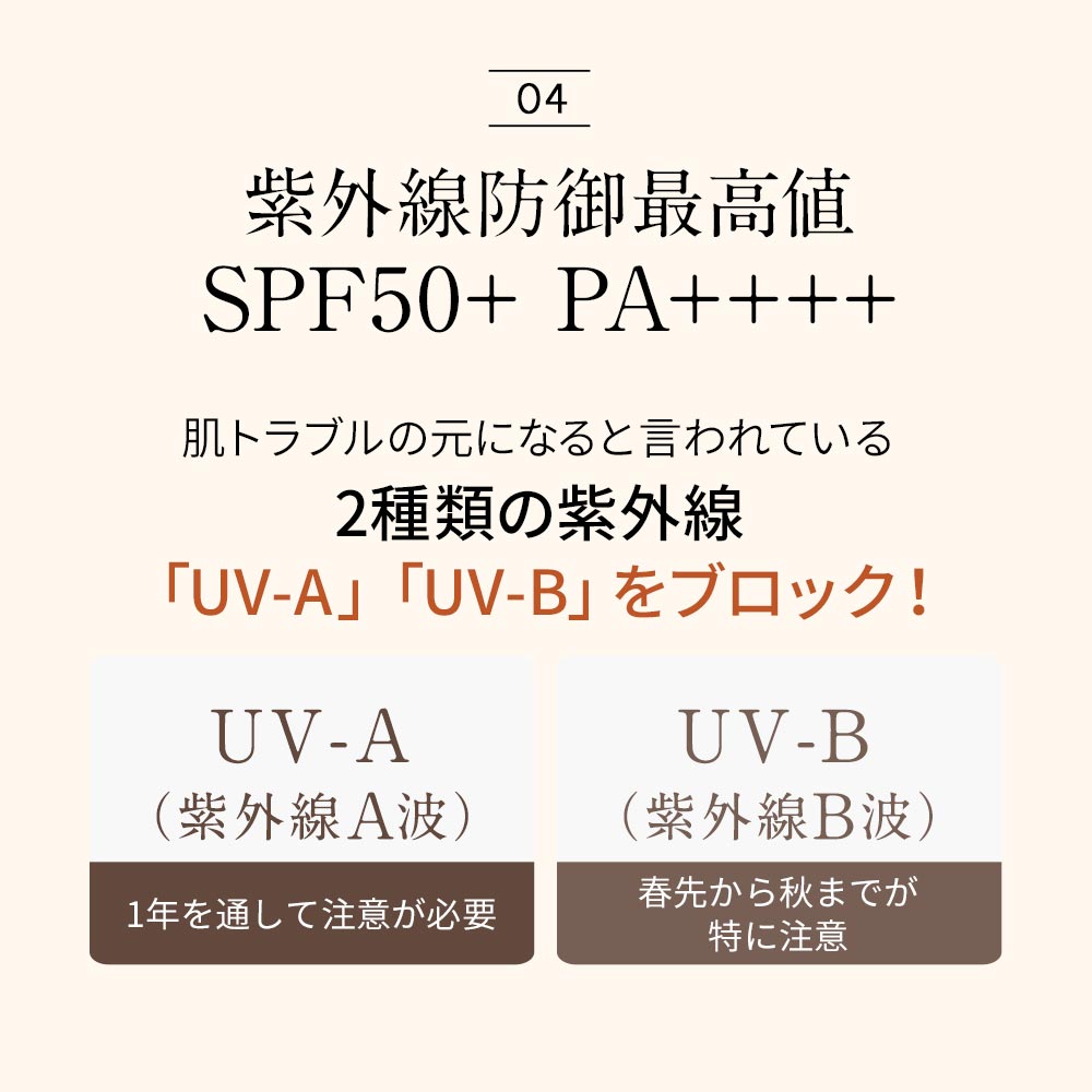 水,シクロペンタシロキサン,酸化チタン,酸化亜鉛,メトキシケイヒ酸エチルヘキシル,DPG,BG,炭酸ジカプリリル,セチルPEG/PPG-10/1ジメチコン,エチルヘキサン酸セチル,1,2-ヘキサンジオール,ナイアシンアミド,ビスエチルヘキシルオキシフェノールメトキシフェニルトリアジン,セスキオレイン酸ソルビタン,イソステアリン酸ソルビタン,メタクリル酸メチルクロスポリマー,硫酸Mg,水酸化Al,トリエトキシカプリリルシラン,ジステアルジモニウムヘクトライト,ラウロイルリシン,ステアリン酸,カプリル酸グリセリル,クエン酸トリエチル,シリカ,(ジメチコン/ビニルジメチコン)クロスポリマー,アデノシン,シクロテトラシロキサン,ジフェニルシロキシフェニルトリメチコン,アロエベラ葉エキス,ティーツリーエキス,チャ葉エキス,ツボクサエキス,香料,酸化鉄